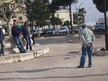A booby had made a nest on a pile of rope on the bow of the adjacent boat and spent the afternoon anxiously scanning the sky for his mate. There is a beach next to the harbour and between the two is an open area for the serious game of boules.