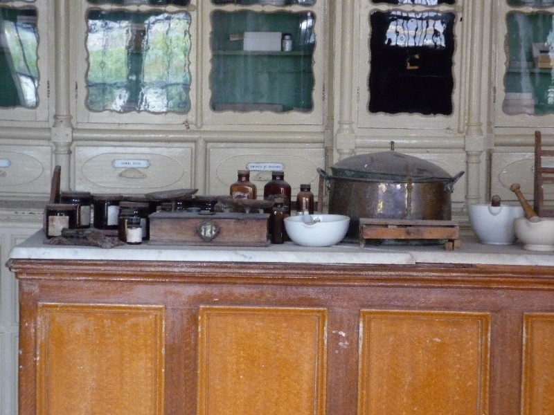...looking as if the pharmacist had walked out many years ago and never returned, leaving the old-fashioned scales and morter and pestle on the counter, now covered with a thick layer of dust. Old apothocary jars lined the shelves, and the drawers were still labeled with medicinal herbs and ingredients, all in French. It had the look of being frozen in time.