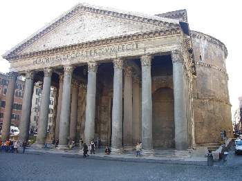 I feel I have had a lifetime's fill of churches and had agreed to go inside only one while in Rome and that was to be St Peters at the Vatican. However the Pantheon changed my mind. It is a delight! Its massive squat presence dominates the Piazza della Minerva and draws you in. Its external ugliness (lacking most of its original marble cladding) belies the crisp interior. The ceiling looks very modern and lets in a tremendous amount of light through the open center. The interior space is vast and free of any supporting pillars. It is hard to think of it as dating back to 128 AD when its last reconstruction was supervised by Hadrian. Apparently the dome is so pleasing to the eye because it is a perfect half sphere, rather than the normal elipsoid dome. This shape made it significantly harder to build and to this day it is the widest masonry dome ever erected. Its weight is supported by cylindrical walls that are 21 feet thick at the bottom. Each massive exterior column appears to be made of a single piece of granite. Inside in a niche is the dark coffin in which Raphael is buried. Above his coffin are two bronze doves and an inscription which reads (in latin);